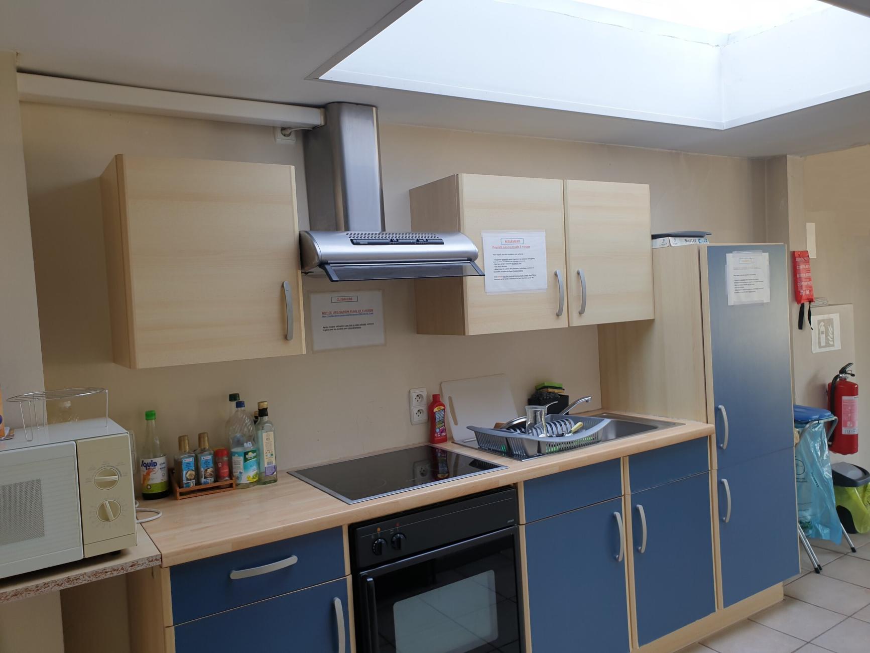 Cuisine commune équipée et séjour avec accès jardin