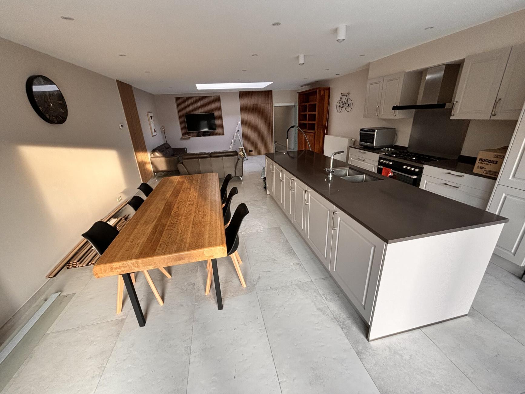 Grande cusine américaine commune avec un îlot central . Elle entièrement équipée .