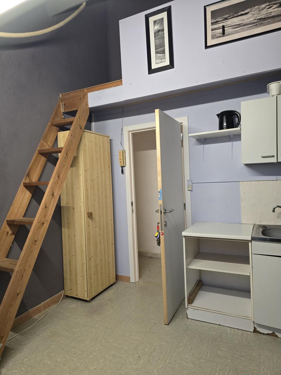 Logement composé d'une pièce comprenant douche, cuisine équipée, bureau, literie, armoires de rangement.